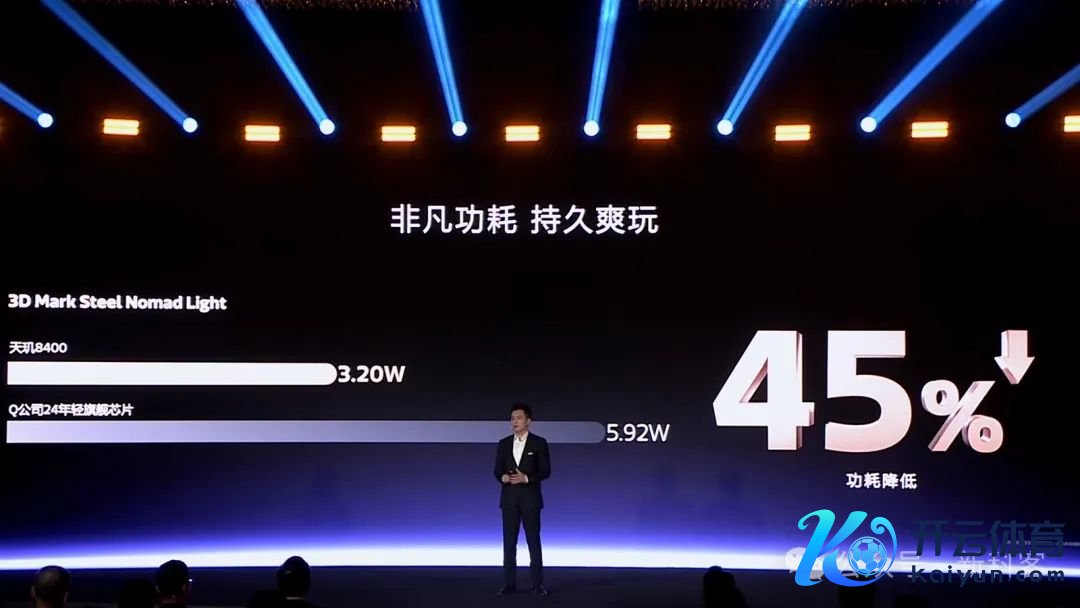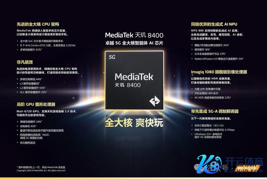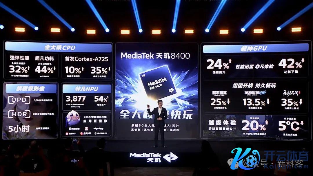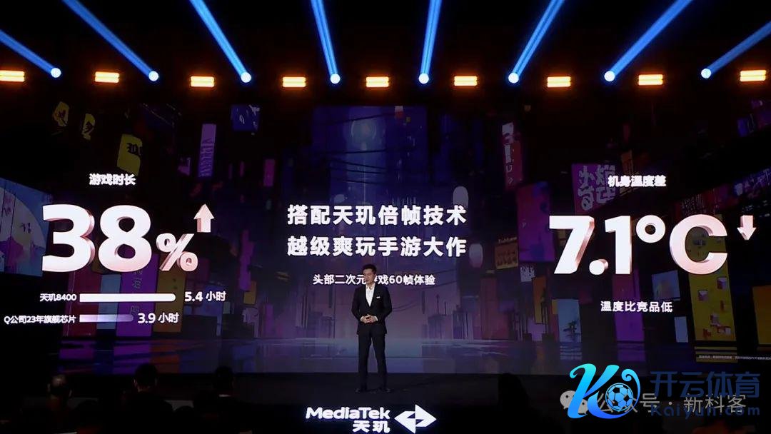 GPU方面,天玑8400搭配的是Arm Mali-G720,峰值性能比上代提高24%,功耗镌汰42%,硬件级光泽跟踪、可变速率渲染、天玑游戏倍帧2.0等先进时刻也皆安排上了。字据MTK官方的先容,即便在游戏和直播双开的重载场景下,天玑8400不仅能踏实运动,还领有出色的能效贯通。字据现场PPT,天玑8400在游戏场景下的续航贯通,远超竞品Q公司24年青旗舰芯片(应该是第三代骁龙8s),而在重载游戏下的续航及温差,则远超Q公司23年旗舰芯片(第三代骁龙8)。