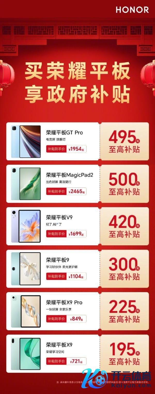 据官方先容,在现行的国度补贴策略下,荣耀平板 GT Pro 最高可补贴 495 元,补贴后起售价钱为 1954 元;荣耀平板 MagicPad 2 最高可补贴 500 元,补贴后起售价钱为 2465 元;荣耀平板 V9 最高可补贴 420 元,补贴后起售价钱为 1699 元;荣耀平板 9 最高可补贴 300 元,补贴后起售价钱为 1104 元;荣耀平板 X9 Pro 最高可补贴 225 元,补贴后起售价钱为 849 元;荣耀平板 X9 最高可补贴 195 元,补贴后起售价钱为 721 元。