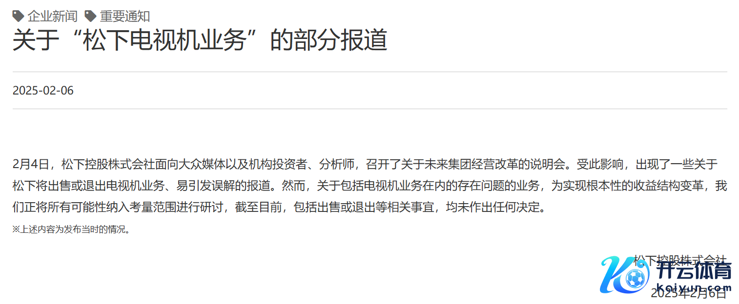 2月6日,松下电器在官网发表声明称,2月4日,松下控股株式会社面向人人媒体以及机构投资者、分析师,召开了对于将来集团商酌转变的评释会。受此影响,出现了一些对于松下将出售或退出电视机业务、易激发误会的报说念。然则,对于包括电视机业务在内的存在问题的业务,为达成根人道的收益结构变革,咱们正将通盘可能性纳入考量范围进行研讨,限制当今,包括出售或退出等说合事宜,均未作出任何决定。