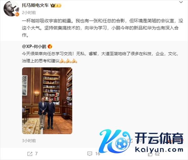 其中小鹏汽车副总裁“托马斯电火车”示意:一杯咖啡领受宇宙的能量,我也有一张和任总的合影,但环境是苟简的会议室,没这个大气。坚握作念臭搞本领的,向华为学习,小鹏本年的新品和华为也有长远迷惑。